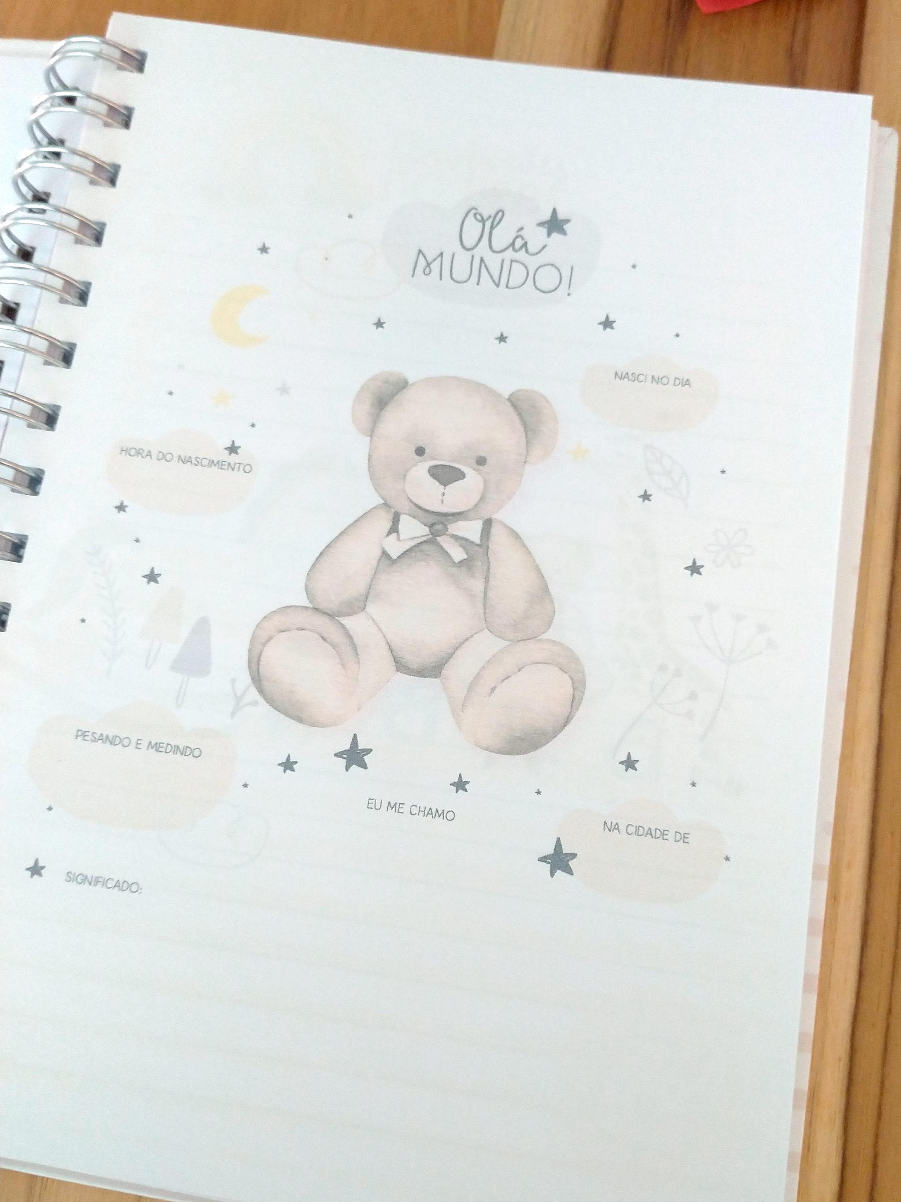 • Páginas com dados do bebê (nome, nascimento, hora, peso e medida, cidade, significado)